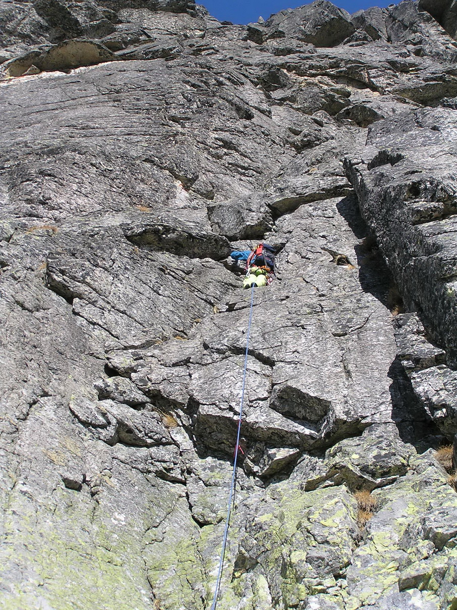 Začína kľúčová tretia dĺžka. Matúš zhora kričí, že sa mu to nezdá také ľahké, aké mal informácie :) Nakoniec sa mi po krásnych platniach darí doliezť k chalanom na štand bez väčších problémov. Kľúčový previštek sa dá obliezť morálovým traverzom sprava. Nebolo treba silu v rukách, ktorú nemám. O to dôležitejšia bola práca nôh.