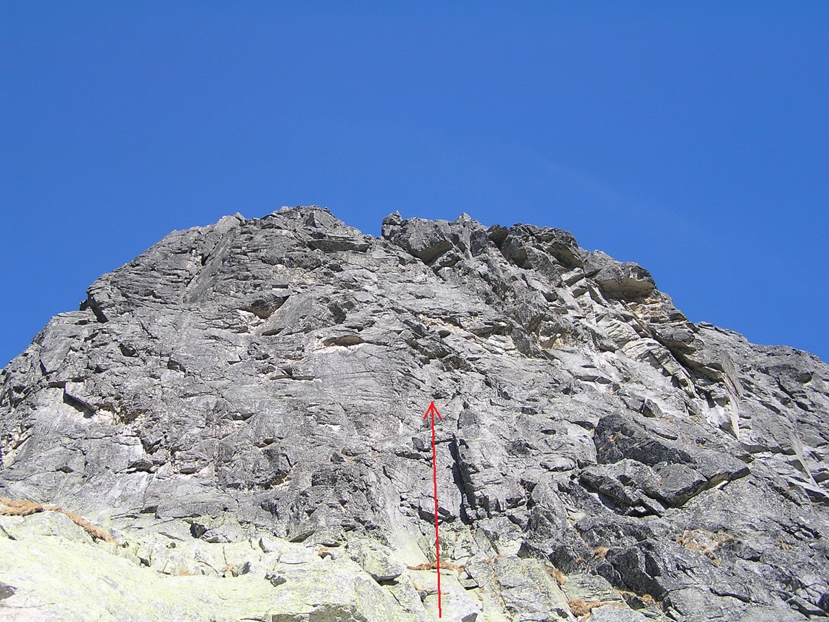 Počasie je ideálne a pod stenou vidíme nastupovať ďalšie dvojky. Do sprievodcu už moc nepozerám. Matúš to má naštudované. Cesta začína v ľavej časti steny. Vybieha tu zo steny taký skalný výbežok. Podľa sprievodcu ním vedie prvá dĺžka obtiažnosti 2/3. Nezastavujeme a v teniskách vybiehame až na trávnatú plošinu, kde by mala začínať druhá dĺžka.