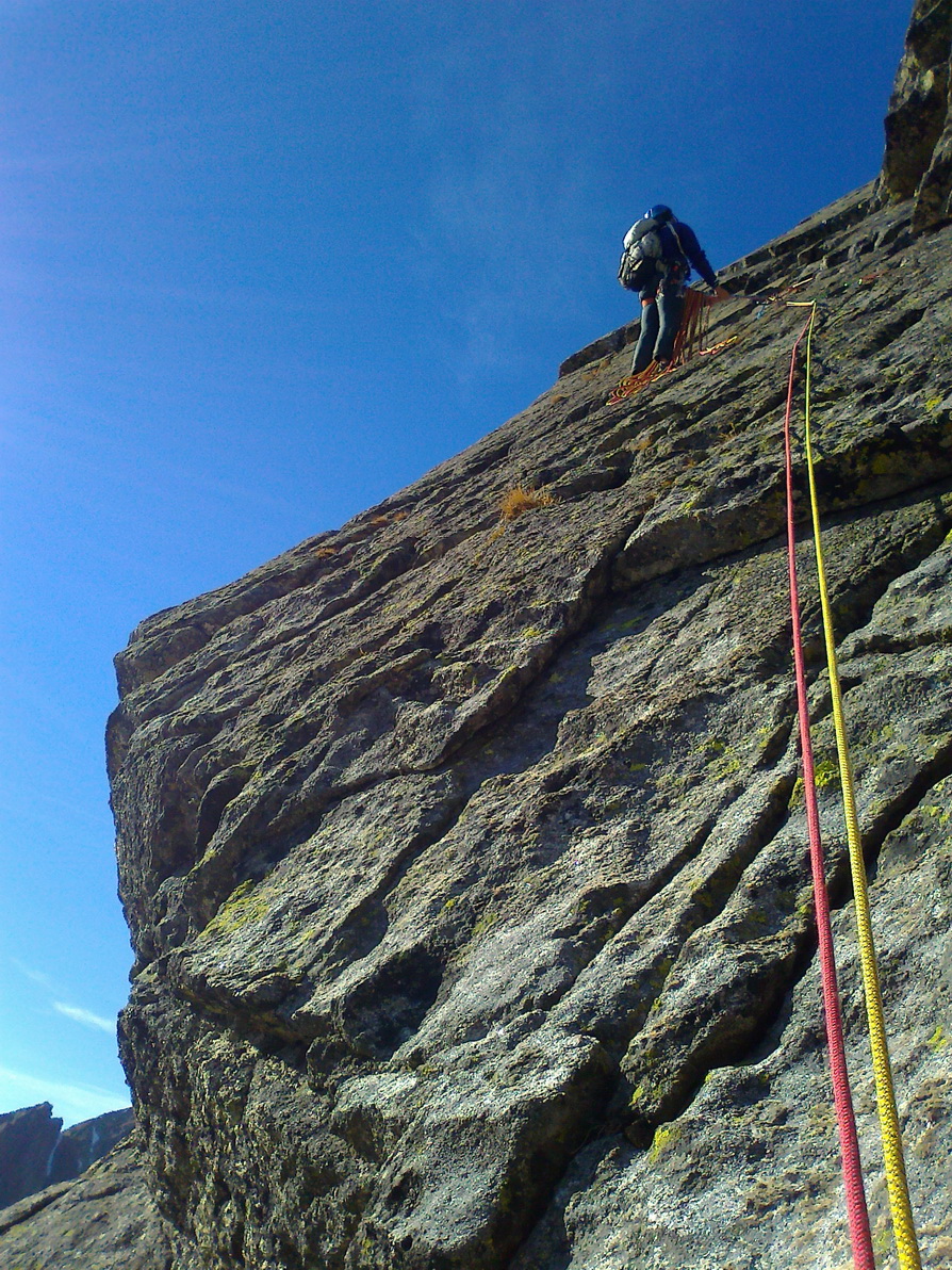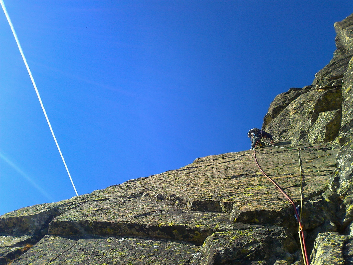 Matúš šiel viac vľavo a v tomto momente už lezie pilierom piatu dĺžku. Ani jeden z nás si nie je istý, kadiaľ presne to malo ísť, ale na pilieri už je smer jasný. Chalani nám utekajú, na pilieri je miesto kde musí aj druholezec kúsok zliezať exponovanú hranu.
