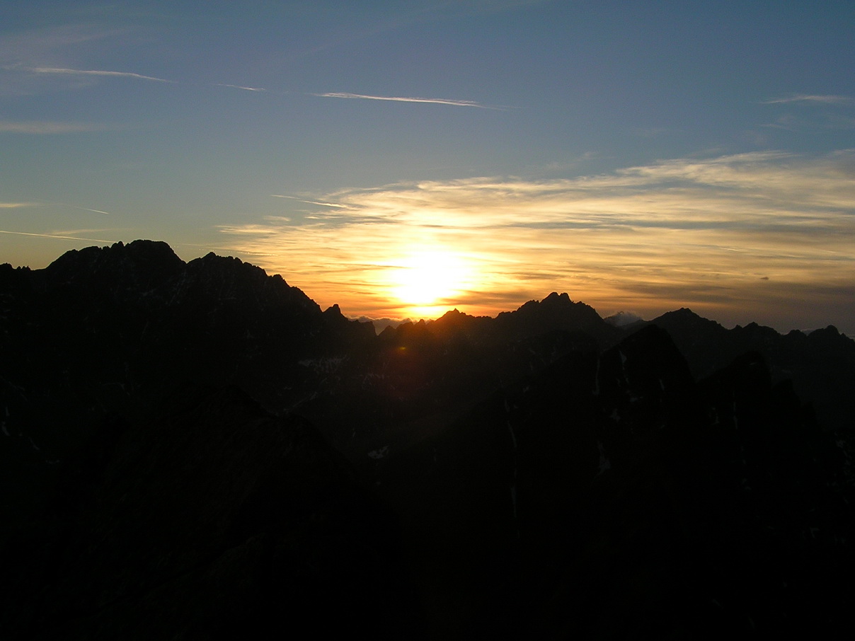 Našu poslednú siedmu dĺžku už istím na ľahkom hrebeni len cez seba. Chalani nás čakajú hore a fotia. Vychádzame na vrchol Širokej veže práve v momente západu slnka. Stres zo mňa opadáva. Sisa zachováva duchaprítomnosť a tak vznikajú fotky, vďaka ktorým potom aj tento článok :)