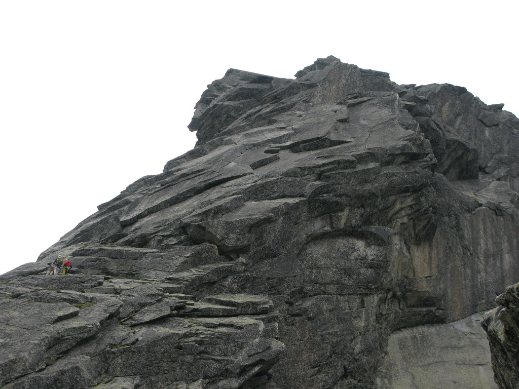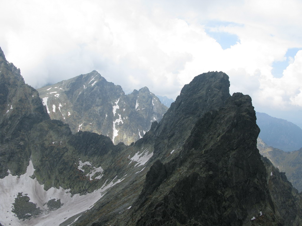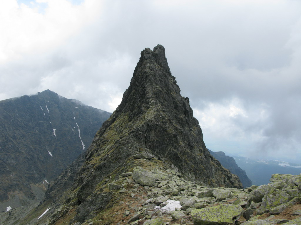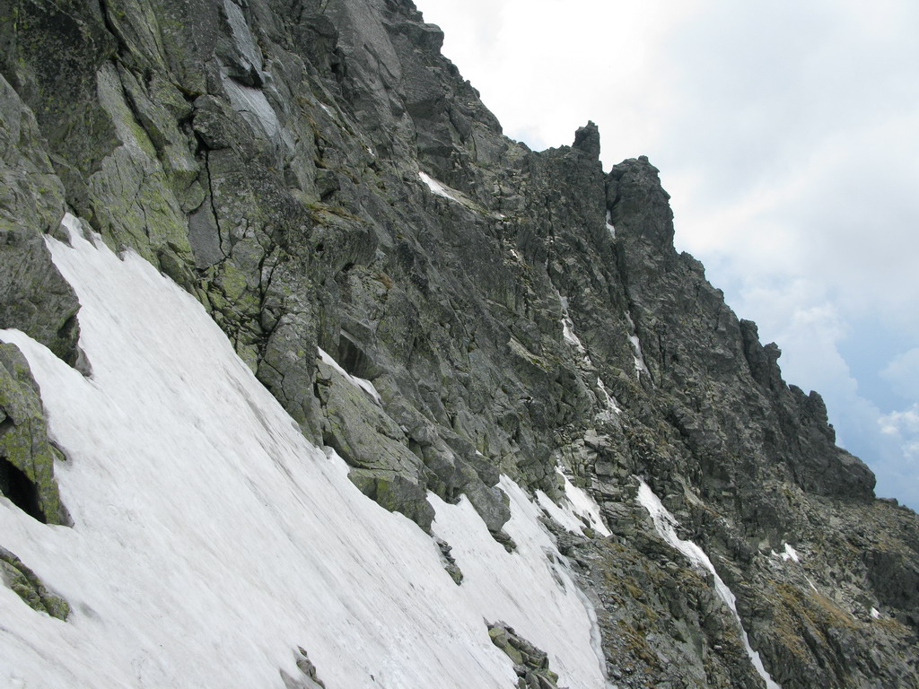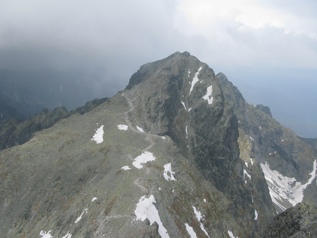 Pri Rumanových plieskach si ujasním ďalší plán: prejsť cez Kohútik, potom sa uvidí. Po ceste ale ešte odskakujem na Ťažký štít (Český). Stále neprší, len občas zaduní. Z Ťažkého štítu mám vrchol Rysov ako na dlani. Vidím vystupovať pár turistov. Ďalší cieľ je jasný. Najprv však musím prejsť cez Kohútik. Reťaze sú zčasti pod snehom, sedačku mám stále na sebe a tak neváham a rýchlo vyťahujem lano. Po šťavnatom traverze snehovým poľom mi už nič nestojí v ceste. Kúsok nad Váhou nechávam batoh pri železnej tyči a ďalej idem už len s foťákom - ako japonský turista.